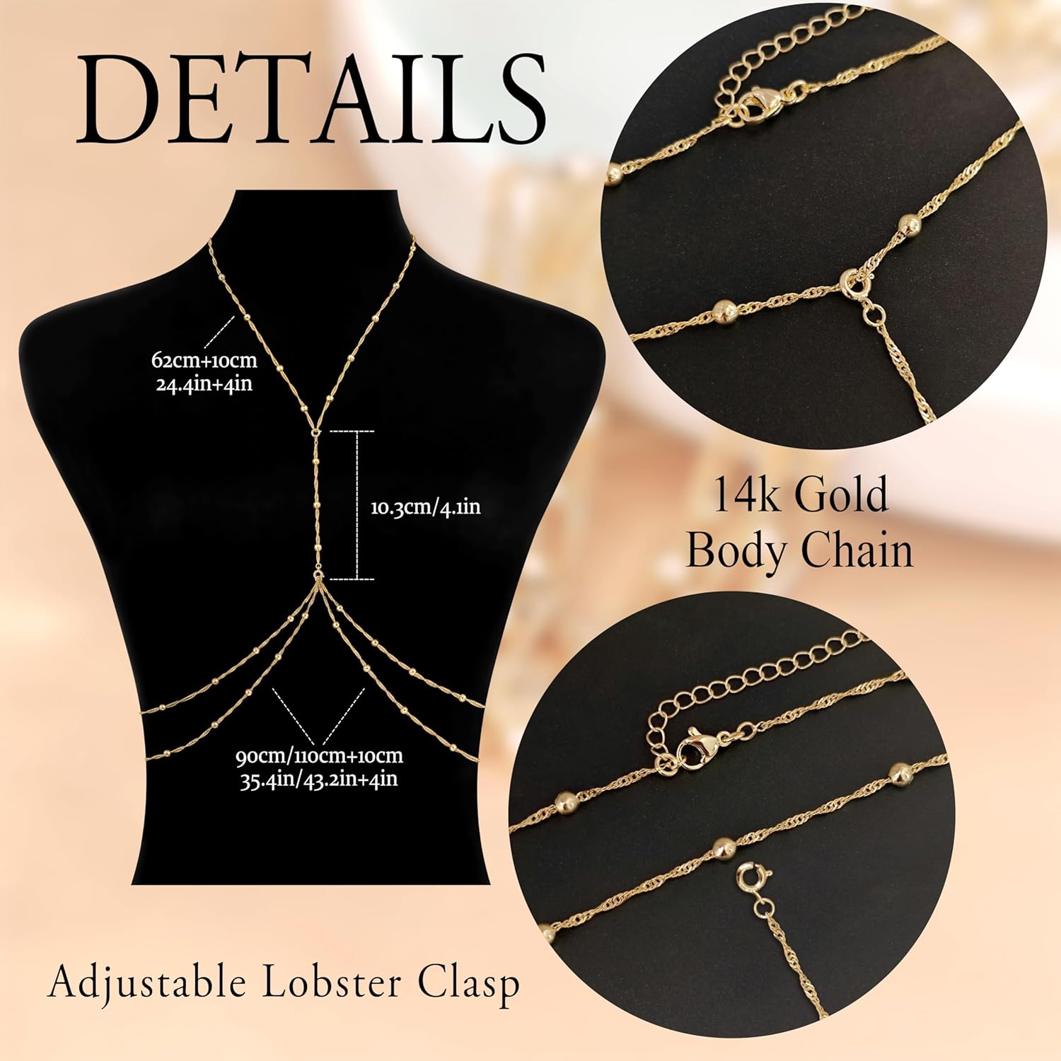 Adjustable and removable design. Each the necklace and waist chain include a 4″ extension chain.