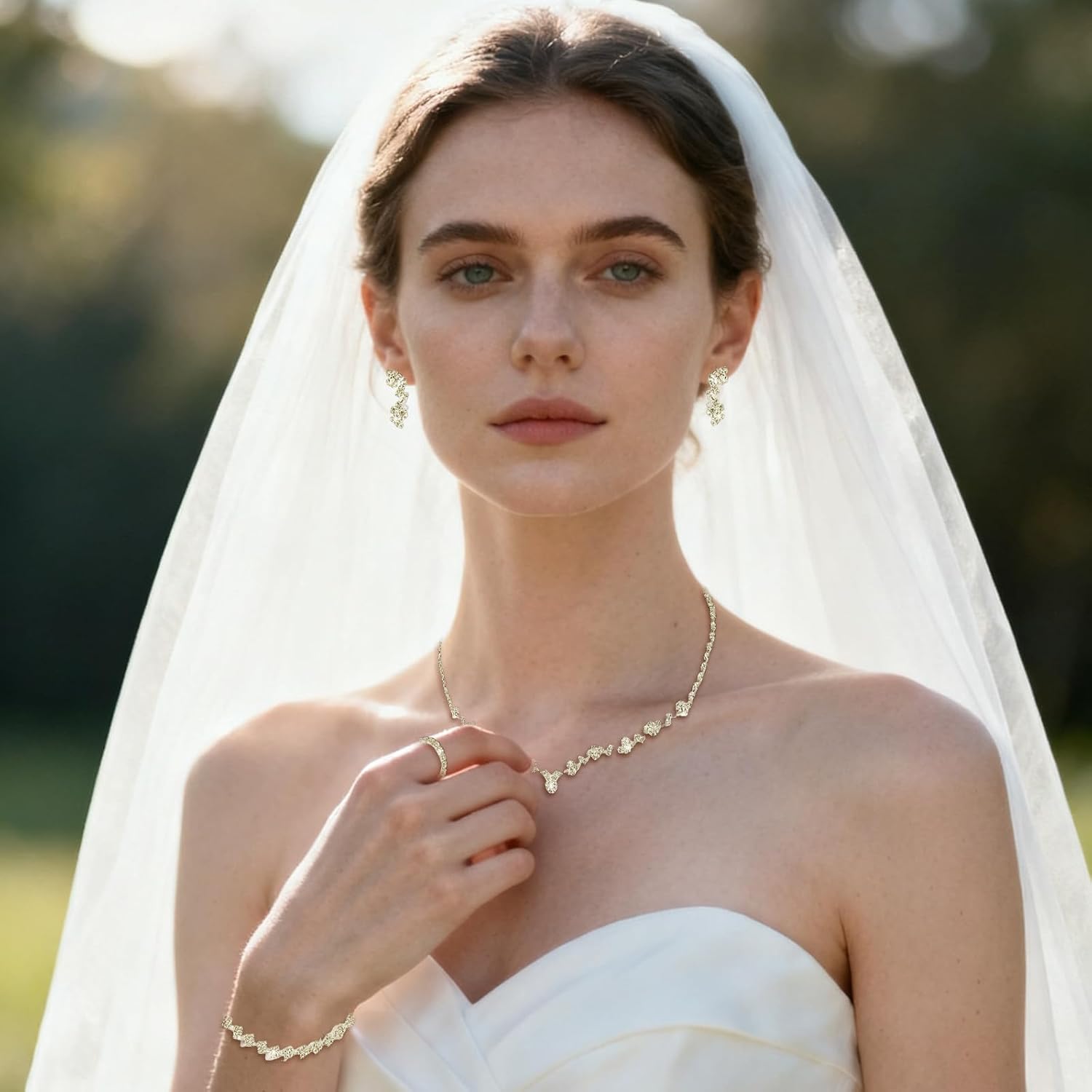 Gold Jewellery Set: Gold-plated alloy and rhinestones type this wedding ceremony set, together with rings, earrings, necklace, and bracelet. Zinc- and nickel-free, it’s good for delicate pores and skin