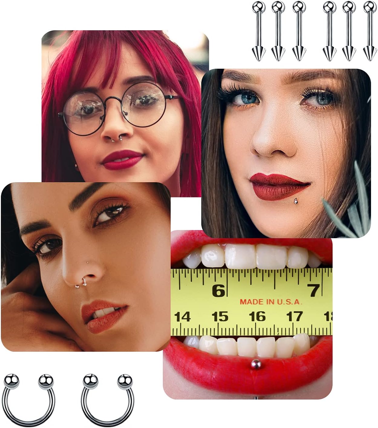 60 Physique Jewellery(5pcs Spherical ball eyebrow barbell,5pcs Pointed eyebrow barbell,5pcs Ball ear bone barbell,5pcs Pointed Ear Bone barbell,5pcs Ball lip barbell,5pcs Pointed lip barbell,5pcs Round horseshoe ring,5pcs Horseshoe Ring with Spiked Ends,5pcs Clip ball,5pcs Stomach Button Rings)
