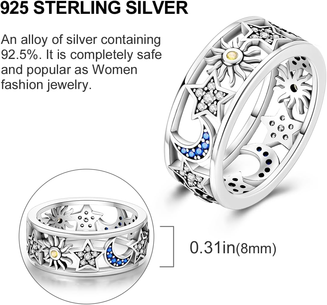 925 Sterling Silver Wedding Band Eternity Rings for Women & | Cubic Zirconia Hollow Design Sun Moon Star Theme | 8mm Wide, Hypoallergenic, Minimalist & Lightweight