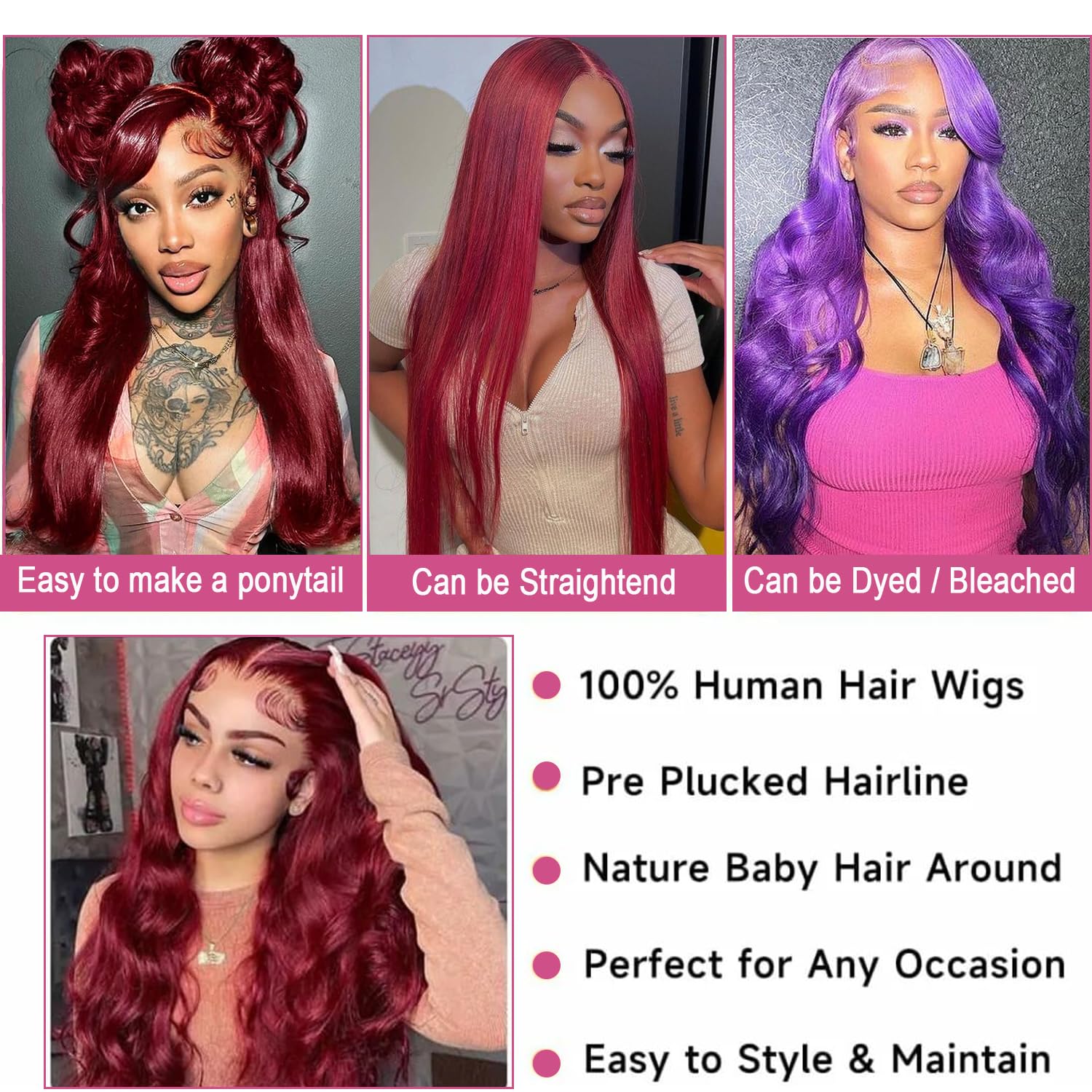 【Burgundy Lace Entrance Wigs Human Hair Wigs High quality】: Lace Entrance Wigs Human Hair Pre Plucked, True to Size, Shedding Free, Tangles Free, No Scent, Delicate, Can Be Dyed&Bleached, Straightened and Restyled, Can Be Aspect Half, Center Half, Excessive Ponytail& Bun, Sturdy, Reusable, Styled As Your Personal Hair.