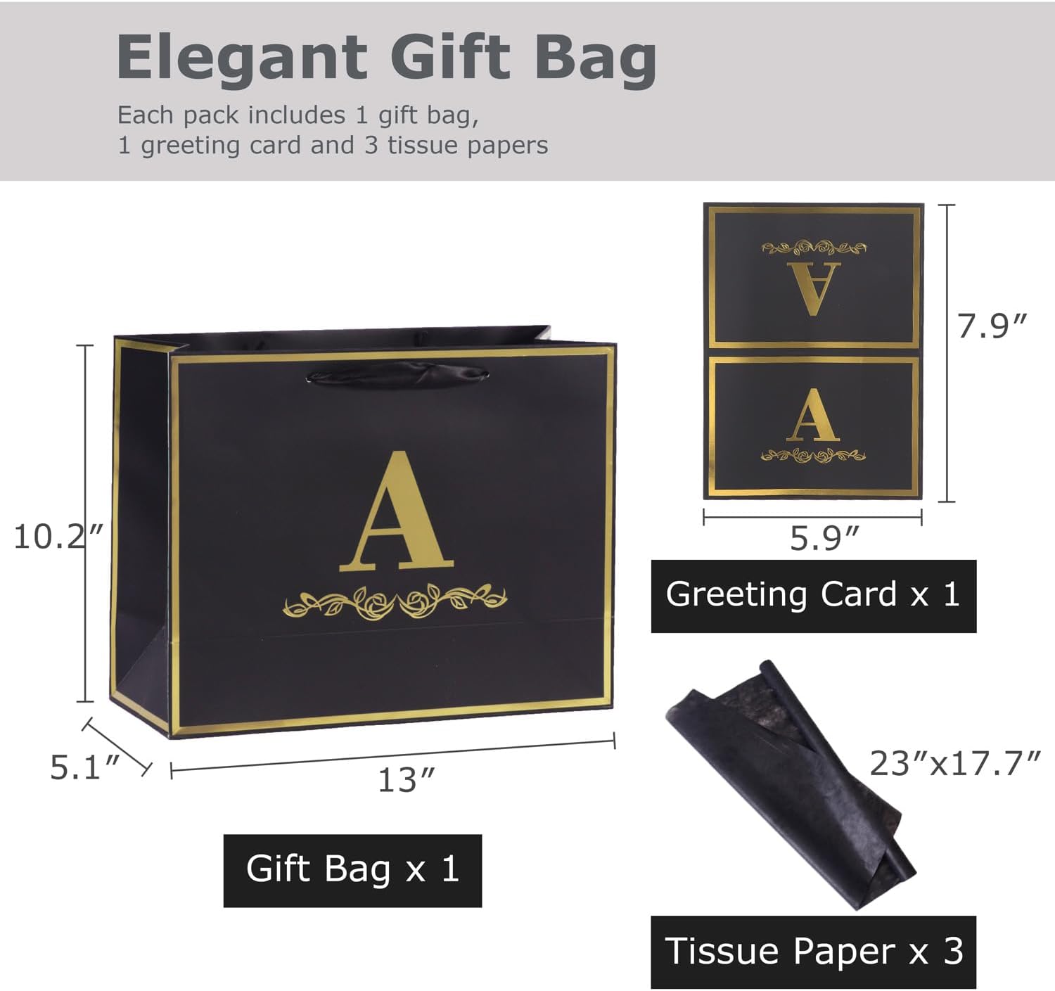 Alphabet Birthday Gift Bag with Card and Tissue Paper for Men Women, 13″ Large Black Gold Personalized Bridal Party Gift Paper Bag for Gifts Wrapping – (Letter A)