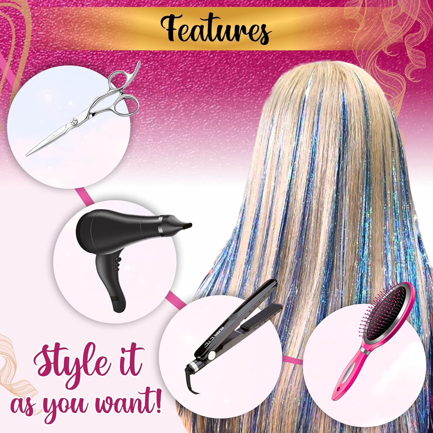 [Package Perfection] Our Tinsel Hair Extensions Package includes 48-Inch lengthy hair glitter strands, with whole as much as 6800 warmth resistant hair glowing strands. The package deal additionally contains, a picket crochet hook, a picket threader, two hair tinsel clips, one plier and 200 micro rings hair tinsel beads