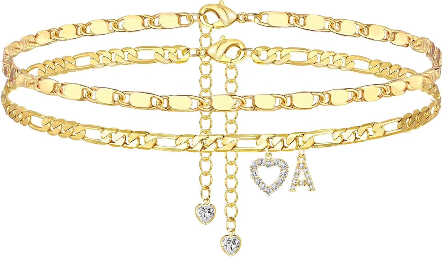 Ankle Bracelets for Women,14K Gold Plated Initial Anklets Dainty Heart Letter Ankle Bracelets Layered Gold Anklets for Women Non Tarnish A to Z Summer Beach Jewelry