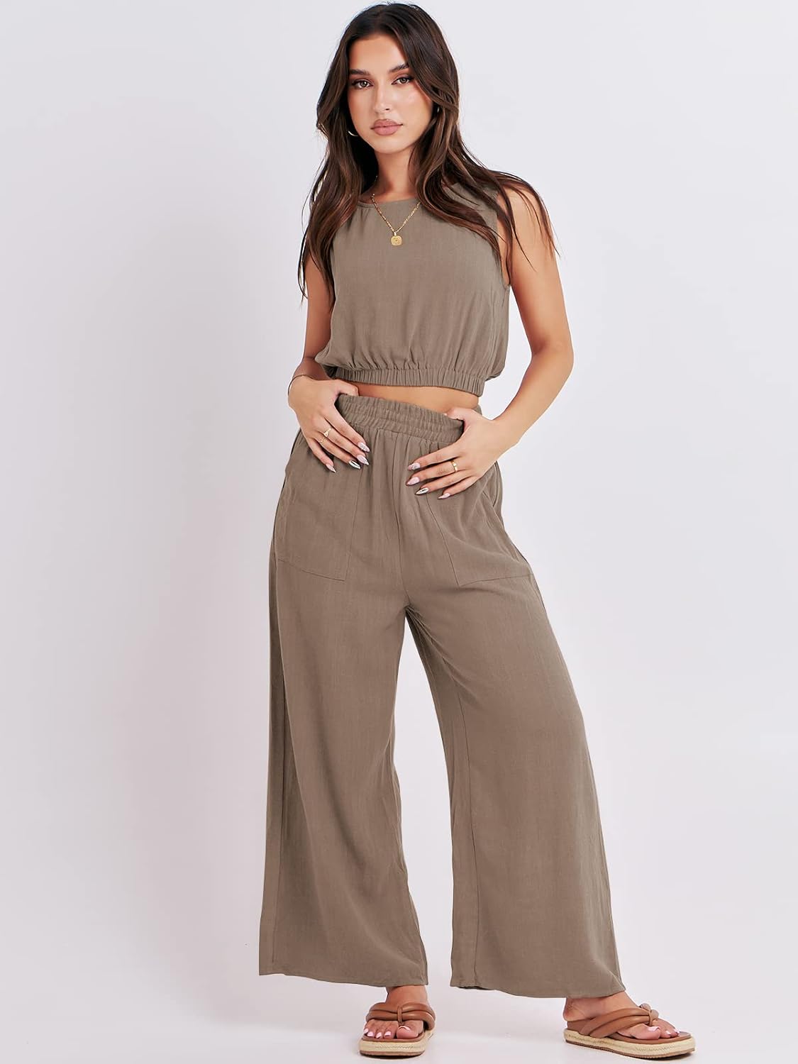 ANRABESS Women’s Summer 2 Piece Outfits Sleeveless Crop Top Tank and Wide Leg Pants Linen Jumpsuit Beach Vacation Sets