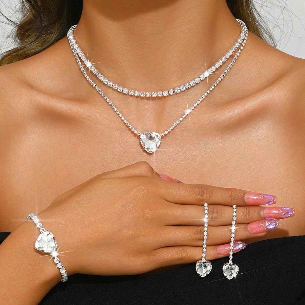 Aukmla Women Bridal Wedding Jewelry Set Silver Crystal Heart Pendant Necklace Earring Bracelet Sets Prom Layered Necklaces