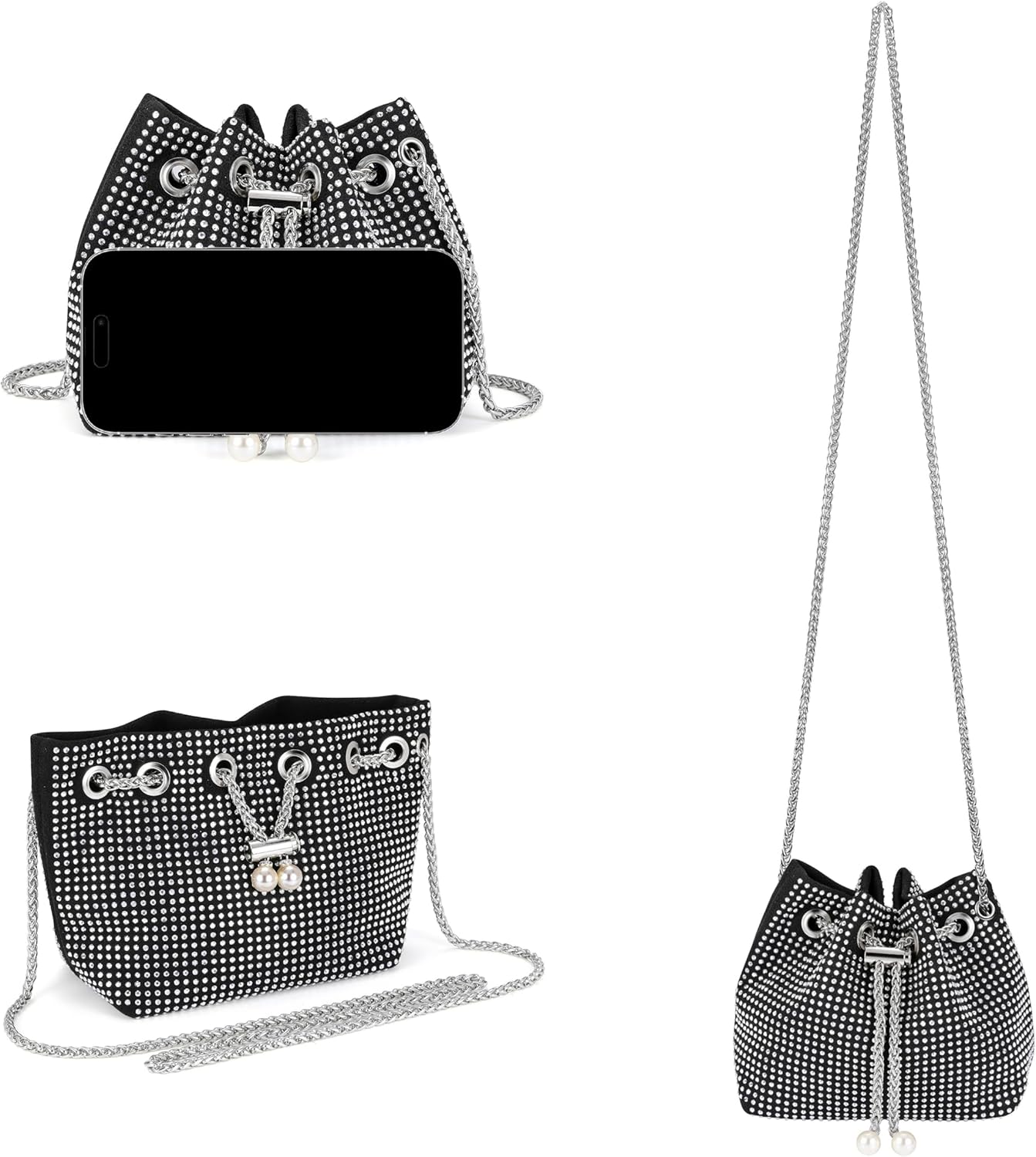 Materials:Bling Full Glitter with pearl drawstring and chain strap,ployester linning Light-weight and stylish fashion.