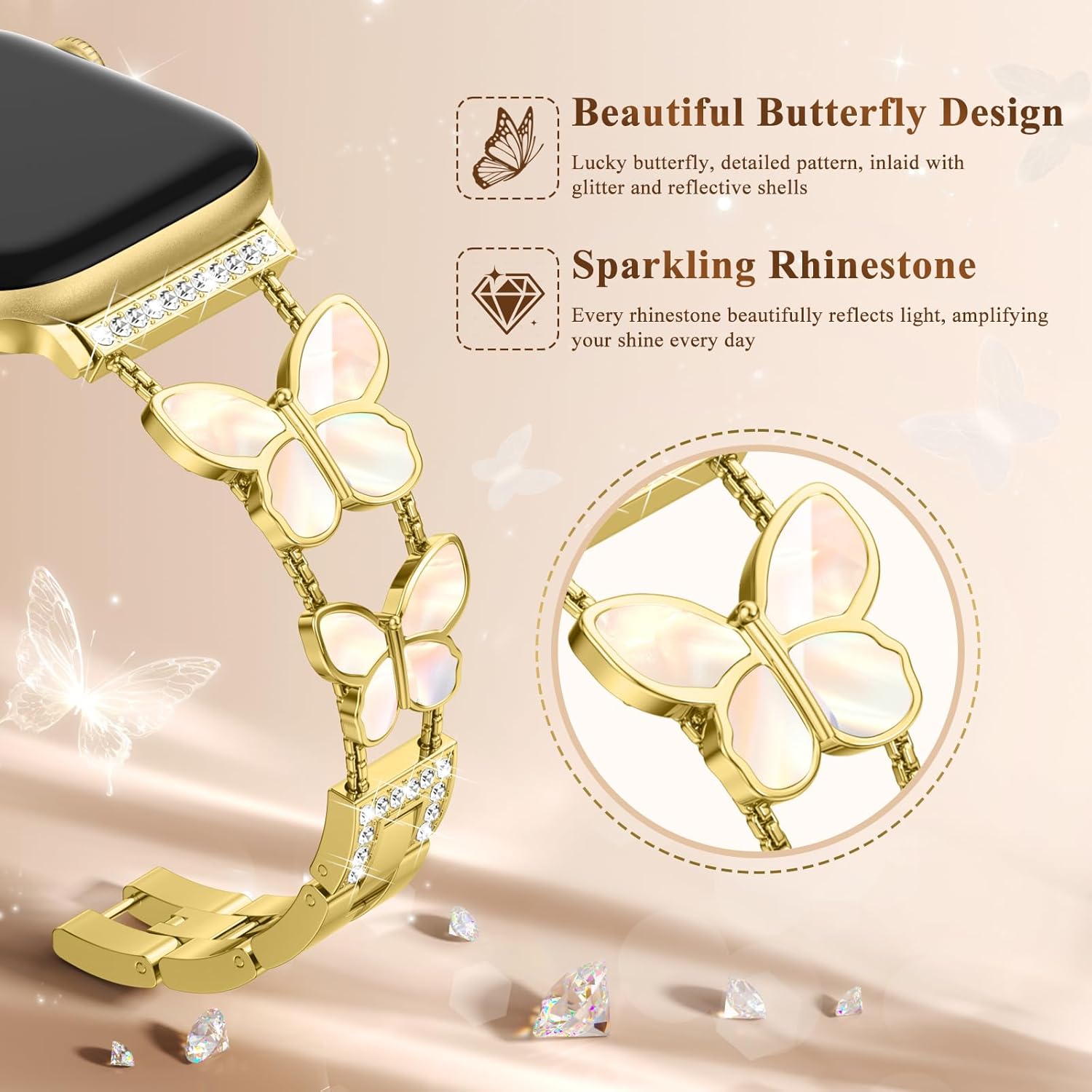 Distinctive Butterfly Design: Improve your attraction utilizing our Butterfly shiny iWatch band. It showcases an expensive steel band adorned with dazzling rhinestones, making it a really perfect trend accent to remodel your iWatch into a trendy mark. The butterfly decoration, symbolizing freedom, magnificence, magnificence, and charm, provides a contact of romance. It embodies beliefs, conveys blessings, and garners compliments.