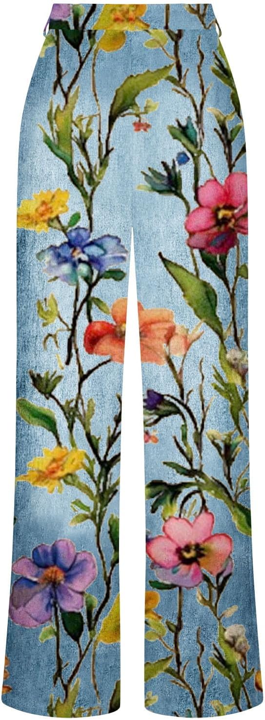 Boho Jeans for Women Cute Floral Printed High Waisted Straight Stretch Jean Baggy Wide Leg Flare Denim Pants with Pocket
