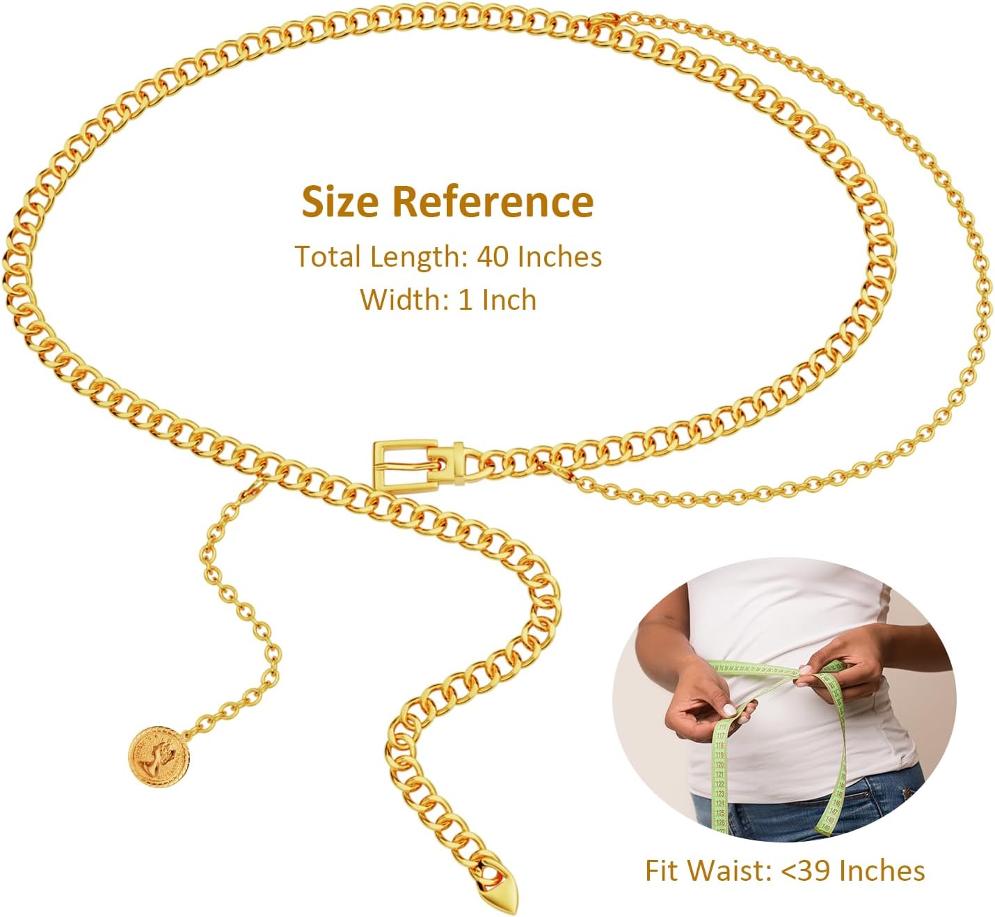 The chain belt comes with an adjustable buckle, match for ladies with a waist beneath 50 inches or weight beneath 170 lbs