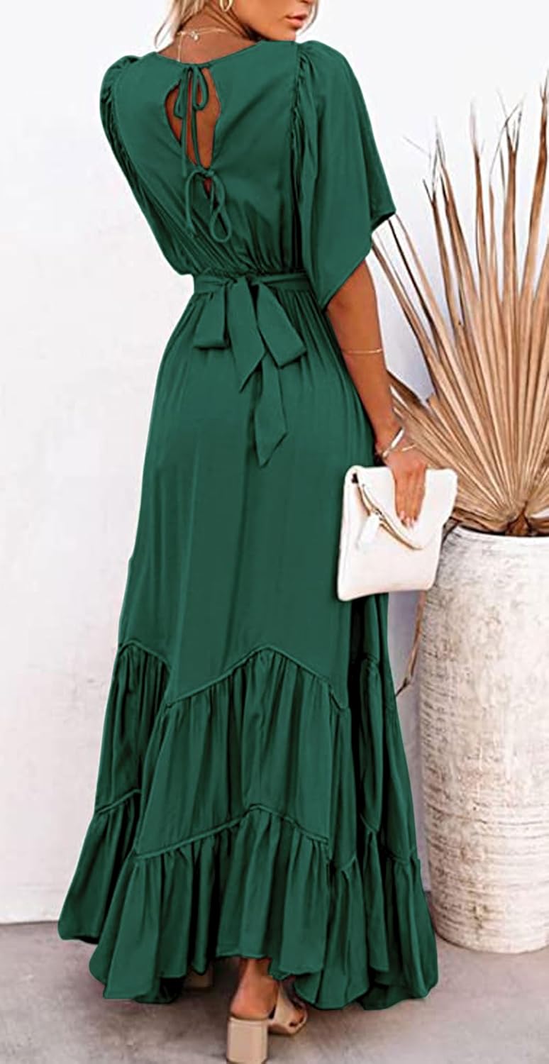 CHARTOU Women’s Boho Ruffle Sleeve Flowy Maxi Dress Lace Up Back Tiered Party A Line Dress