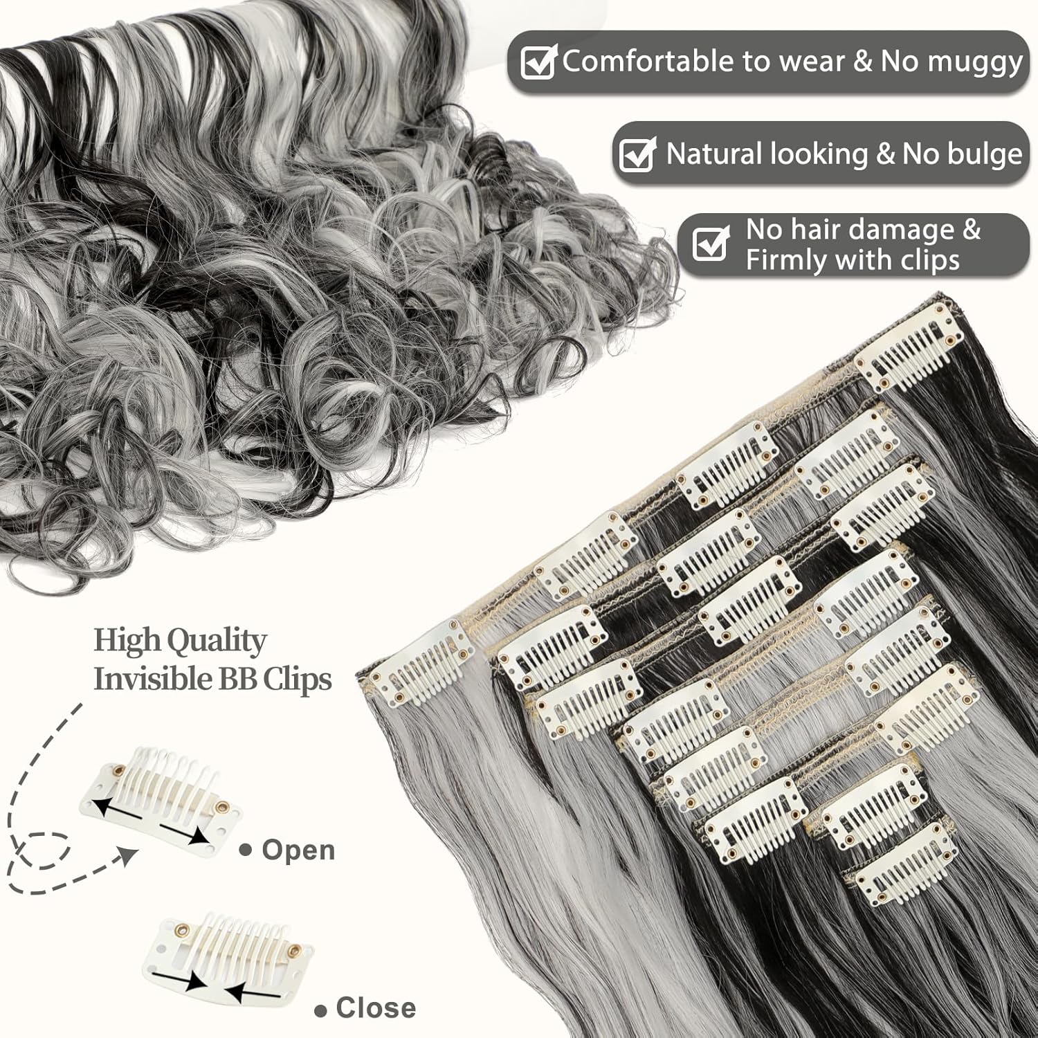 Be the first to review “Clip in Hair Extensions 24 Inch 8PCS Natural Black Mix Silver Grey Long Wavy Synthetic Hair Extensions Clip ins Thick Double Weft Hair Clip Extensions for Women”