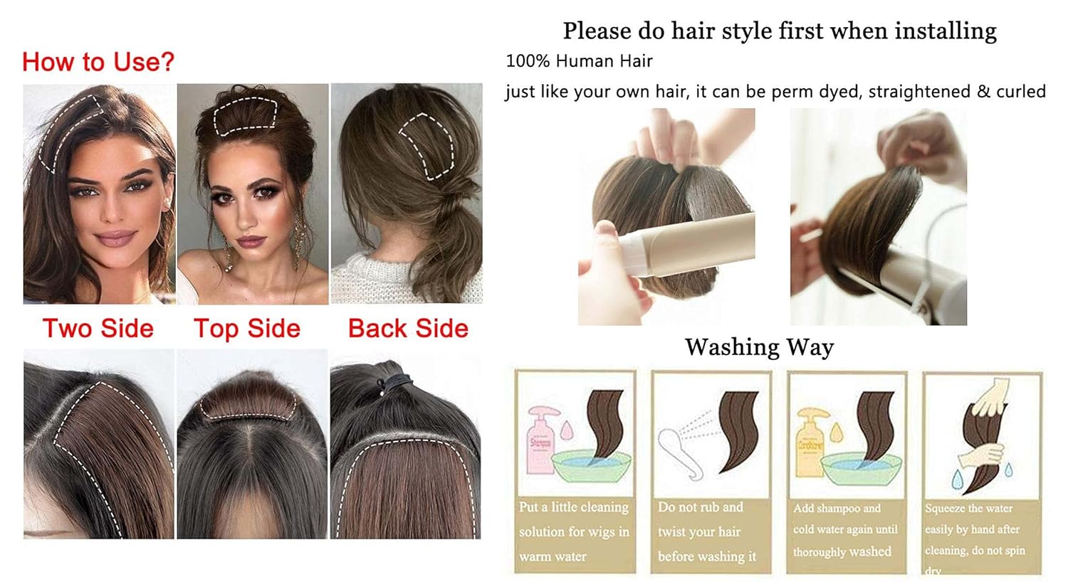 3.Materal:100% REAL REMY HUMAN HAIR,non-toxic and innocent.silky straight hair.Clip-on bangs create you a model new look. Good match and luxury to put on all day for any event, combine with pure hair.❤❤Will be dyed & permed beneath 356 ℉.