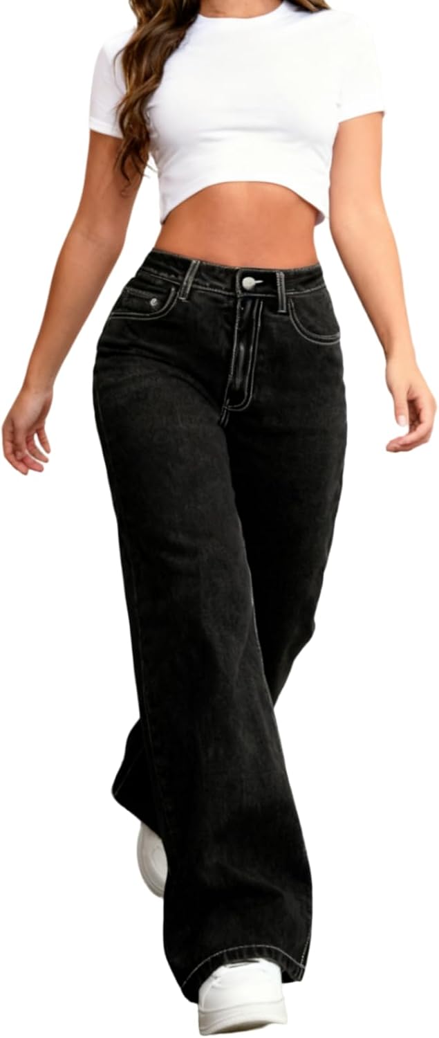 Cuyulitcik Womens Plus Size Wide Leg Jeans High Waisted Stretchy Denim Pants Blue Straight Leg Trend