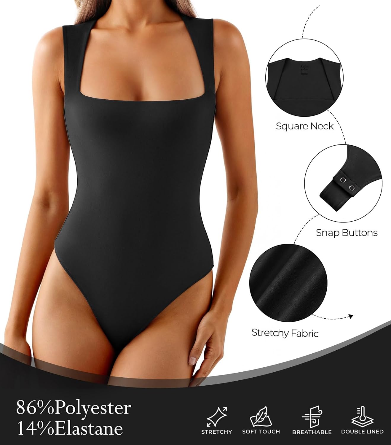 Cyanstyle Women Sexy Square Neck Thong Bodysuit Double Lined Sleeveless Trendy Going Out Body Suits Tank Tops Black Small