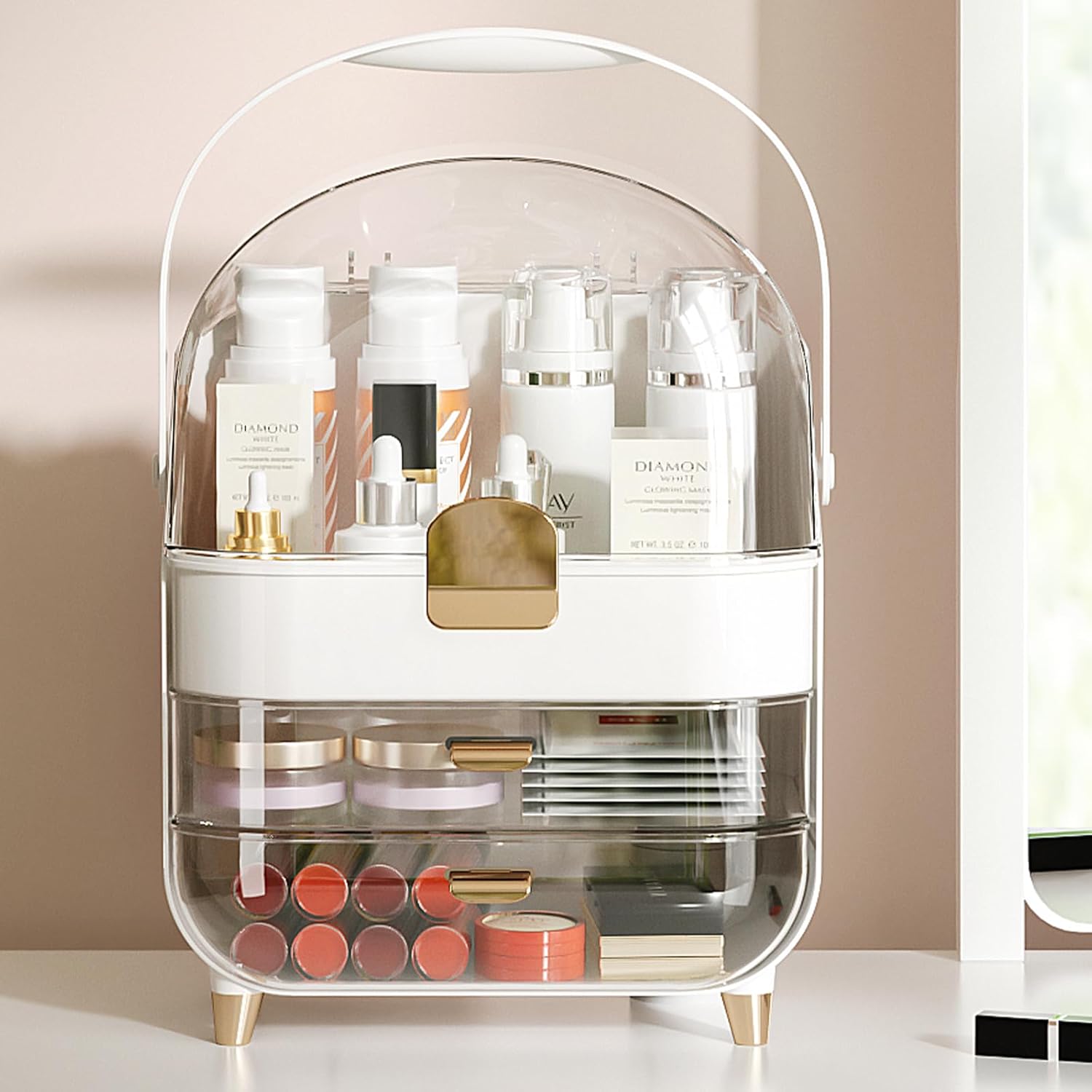 Trendy Attraction, Lovable Current – Impress and delight somebody particular with this beauty organizer, that includes an expensive golden deal with, smooth clear cowl and drawers. Combining fashionable allure with luxurious attraction, this uniquely designed make-up organizer for self-importance is the perfect present for any event, leaving a long-lasting impression.