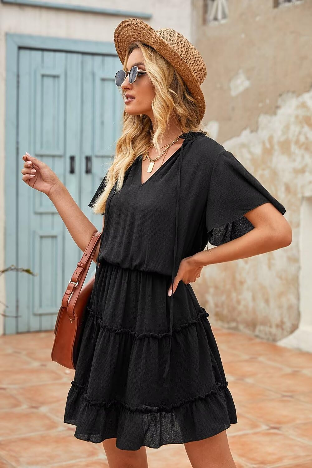 the Ruffle Tiered Gown is a superb transition piece to Spring! That includes a billowed match on a gray textured cloth. Designed with a break up neck, necktie, elastic waistband and ruffle trimming.