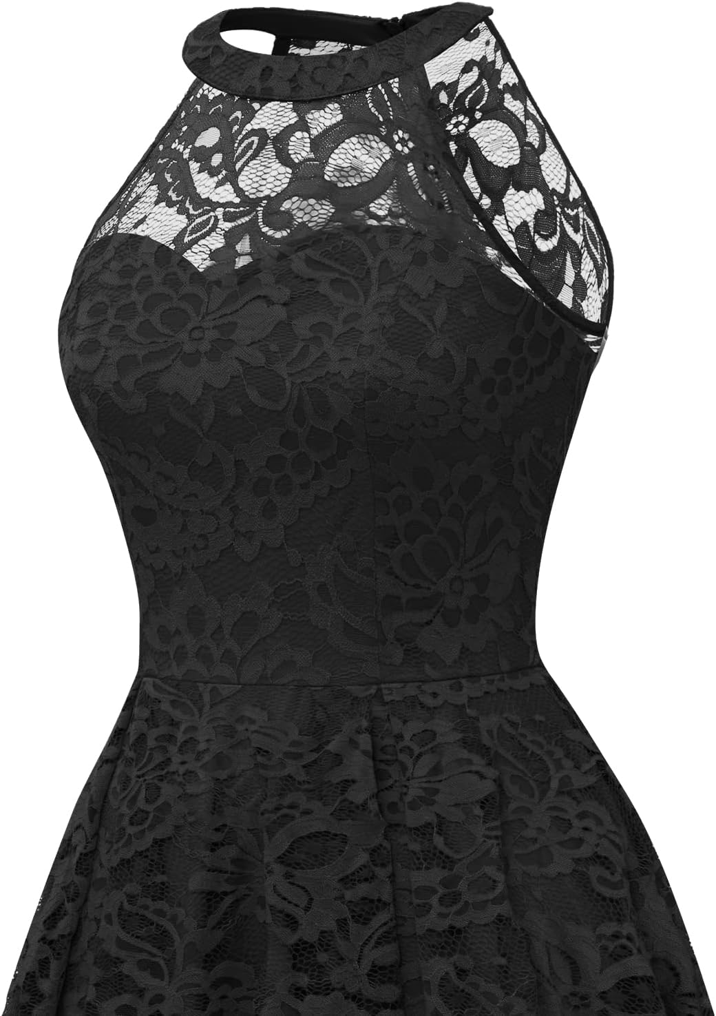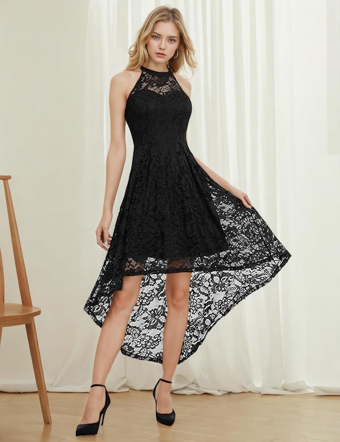 Excessive-low hemline, halter-neck, lace floral, again zipper.