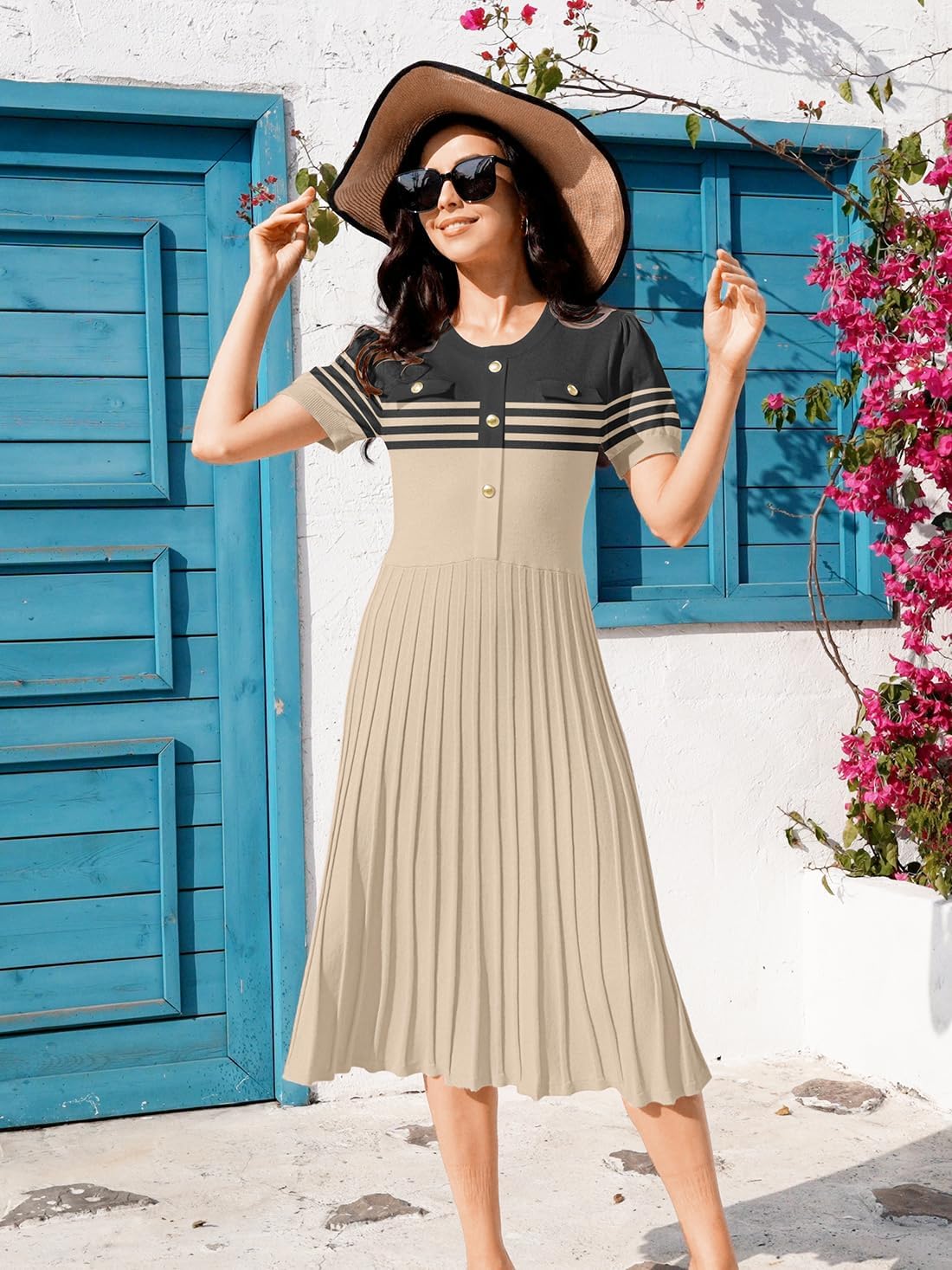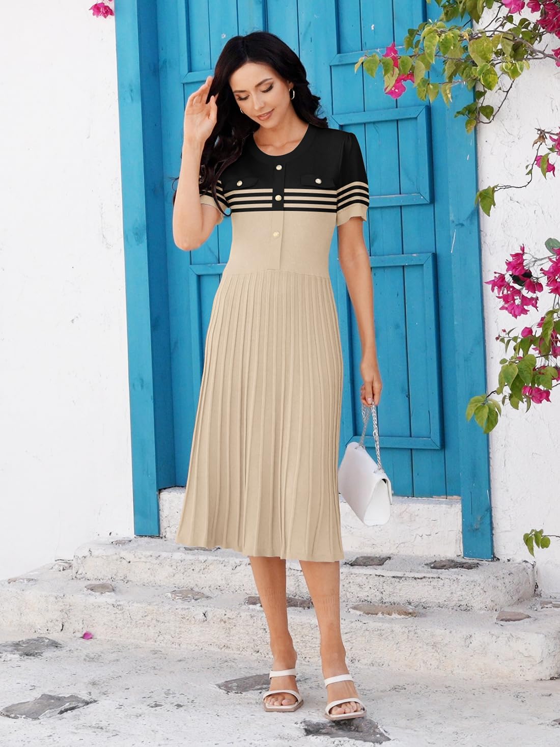 Womens Informal Brief Sleeve Striped Button Midi Gown