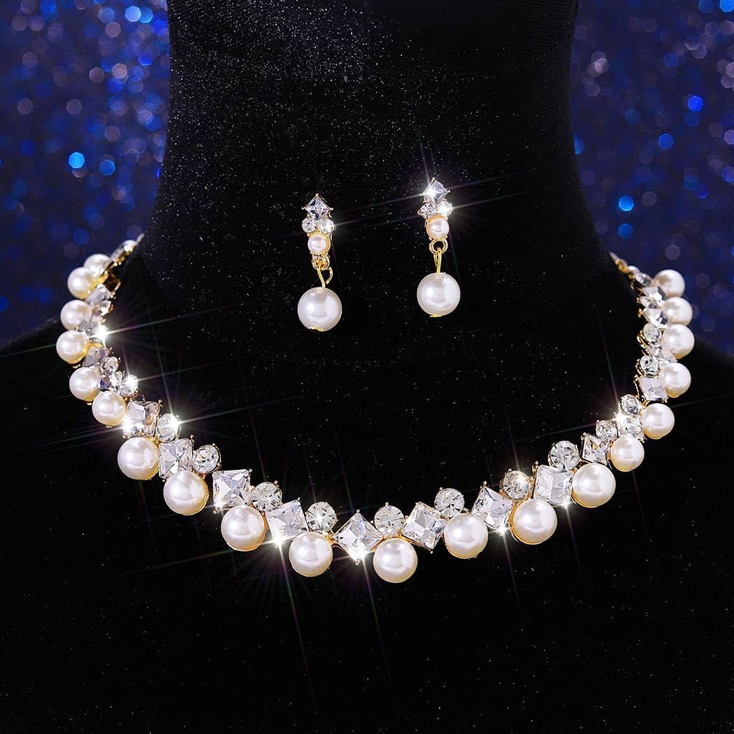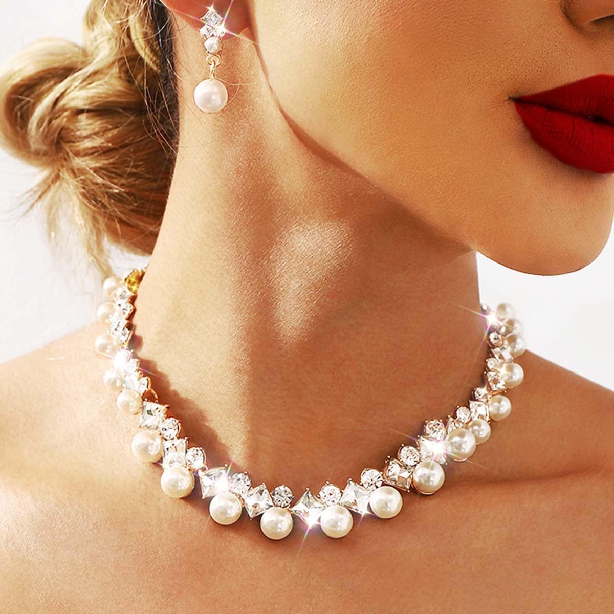Designed for brides, bridal events, and trend fanatics, this set contains a sparkly choker necklace and matching earrings, adorned rhinestones and pretend pearls set on a gold-plated chain.