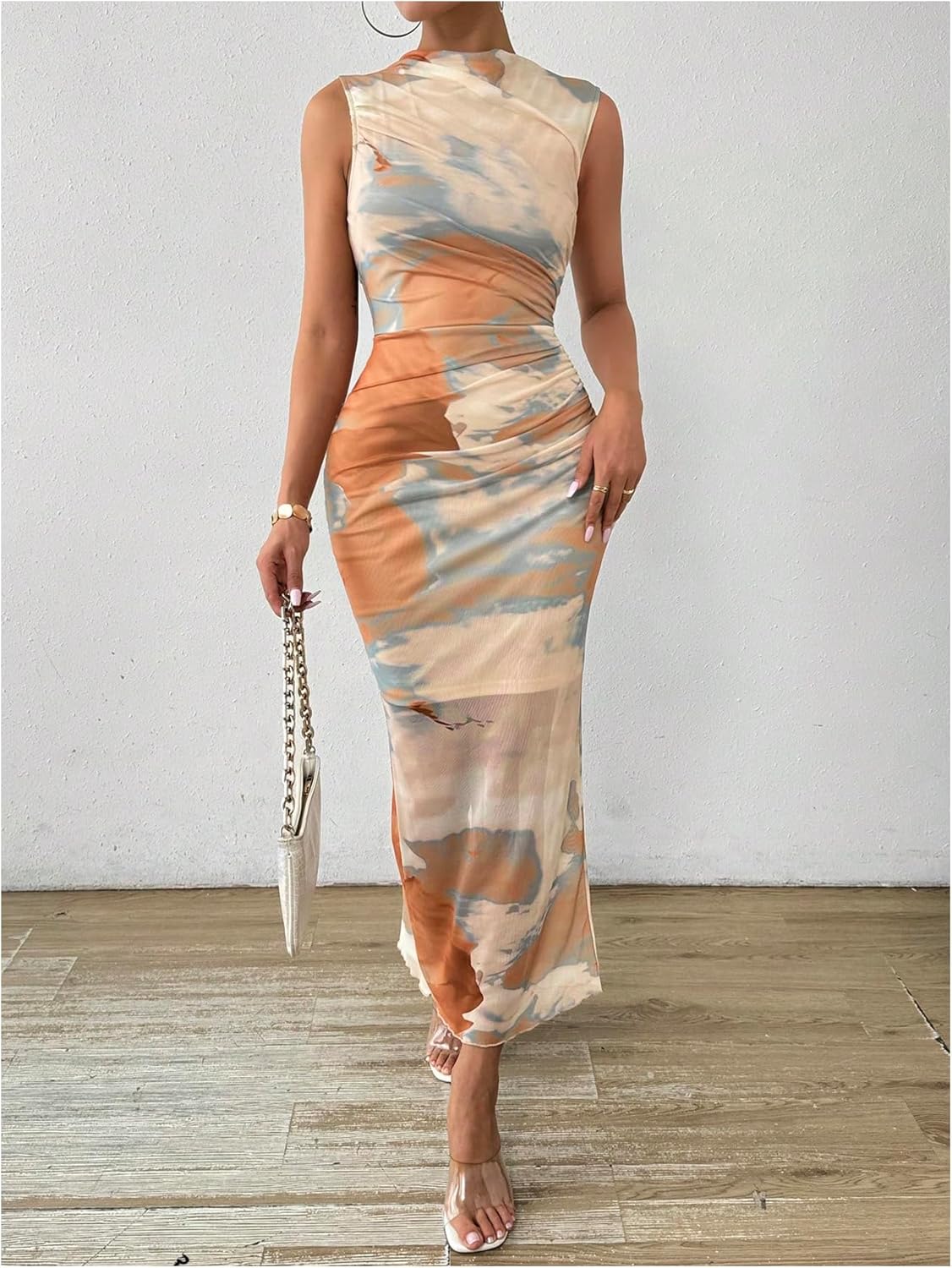 Floerns Ladies’s Sleeveless Tie Dye Mock Neck Ruched Slit Hem Get together Bodycon Gown