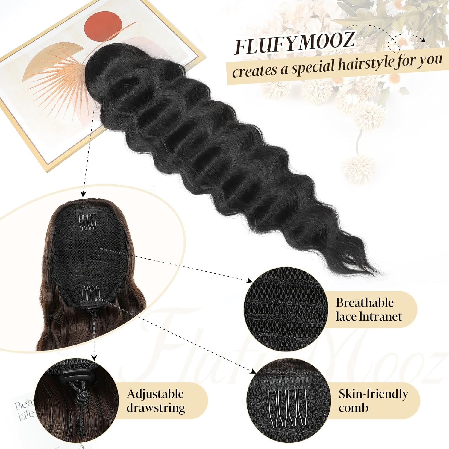 FLUFYMOOZ Ponytail Extension, 26 Inch Wavy Drawstring Ponytail Long Ponytail Hair Extension Soft Synthetic Hairpiece for Women Natural Black