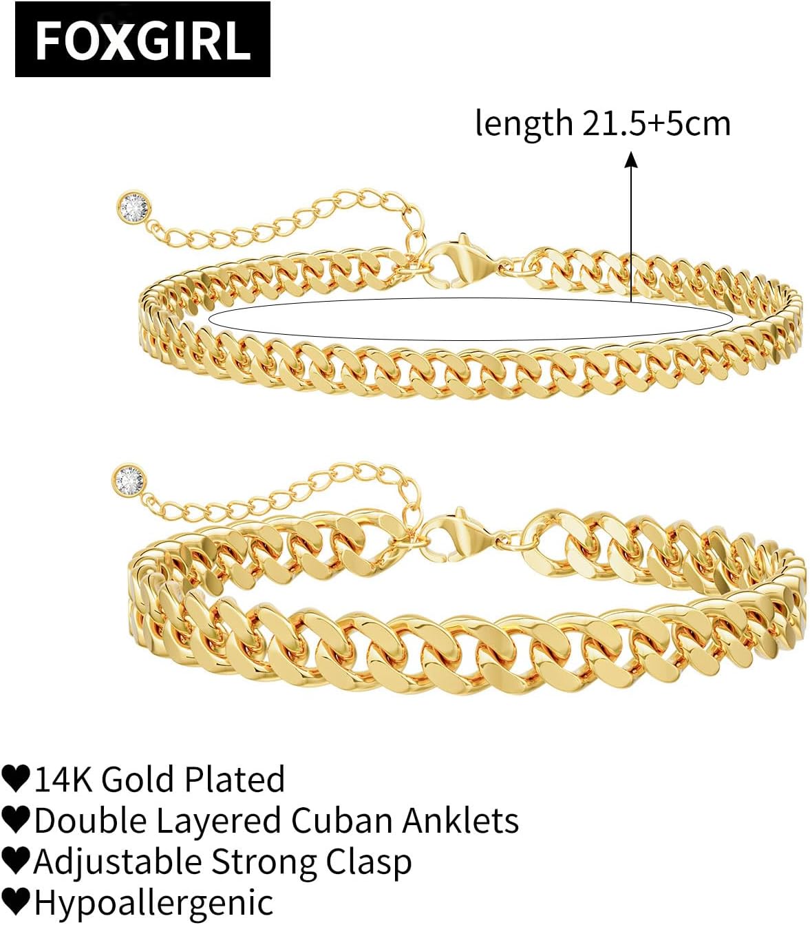 8.5″ +2″ 2Pcs 14K Gold Plated Cuban Hyperlink Anklets