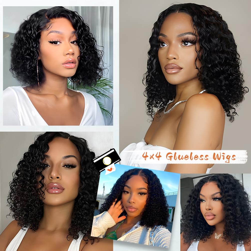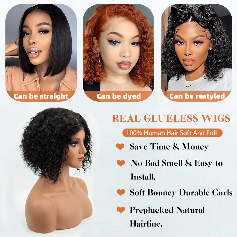Glueless Wigs Human Hair Pre Plucked Pre Cut, Short Curly Deep Wave Lace Front Wigs Human Hair, 180% Density Wear and Go Glueless Bob Wig Human Hair for Women 10 Inch Natural Black