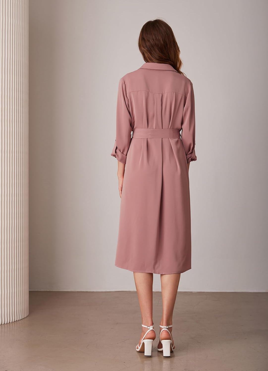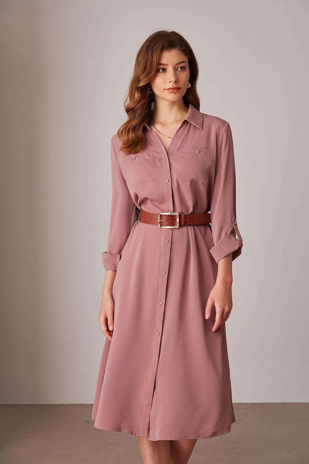 GRACE KARIN Ladies Informal Shirt Clothes Adjustable Sleeve Belted Midi Costume