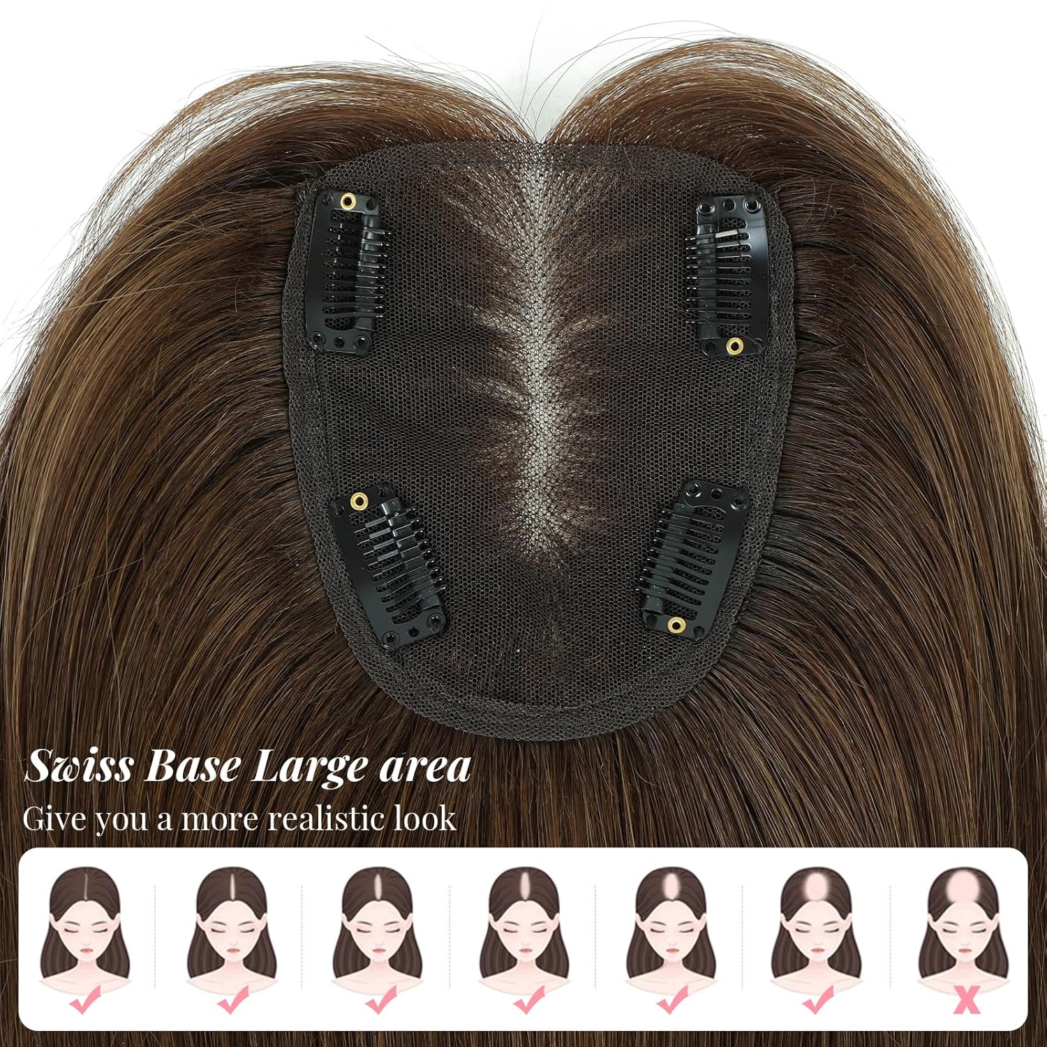 Breathable swiss base:The hair toppers are made with Swiss base, which is translucent, tremendous light-weight, and breathable, hair topper gives the look of pure hair progress straight from the scalp for a pure look. And designed with a technological radian, it matches a lot of the heads in consolation