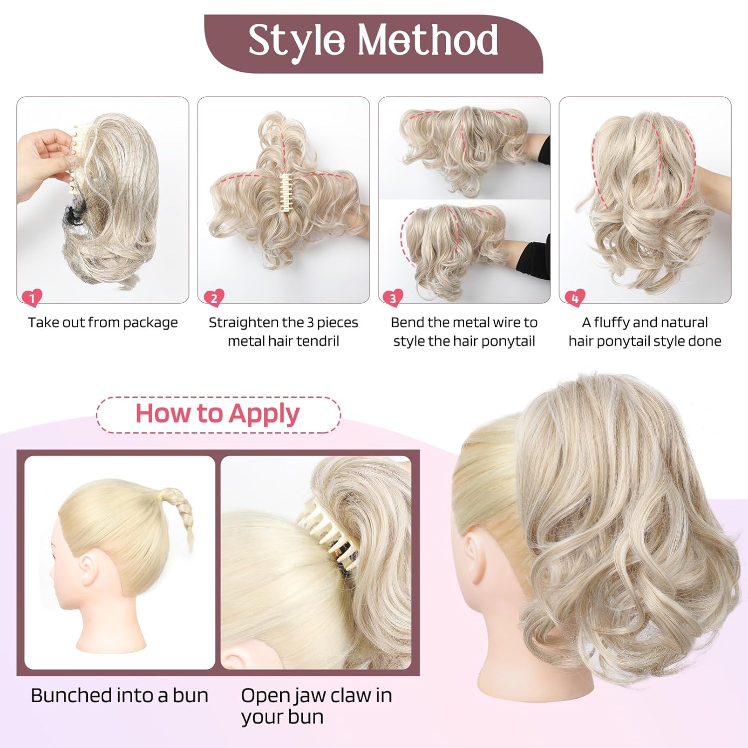 [HOOJIH INNOVATION] HOOJIH blends versatile metallic wire hair equipment with claw clips to create a trendy and fluffy ponytail and hair bun look. The coiffure will keep in place all day even throughout lively or dynamic actions
