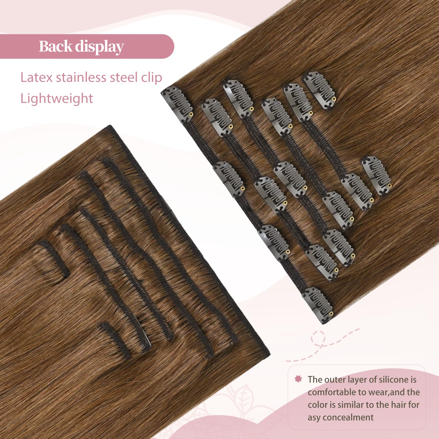 Chestnut Brown Hair Extensions Materials High quality: 8A grade human hair, 100% actual human extensions, no tangling, no shedding. silicon-backed clips are robust, hidden & light-weight, defend your pure hair,guarantee your hair sits naturally