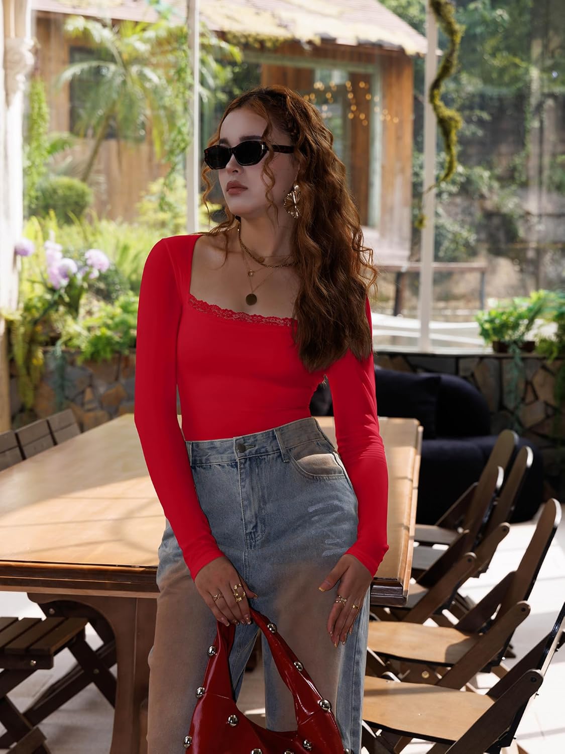 HYZ Girls’s Attractive Lace Sq. Neck Lengthy Sleeve Y2K Going Out Get together Primary Bodysuit Tops