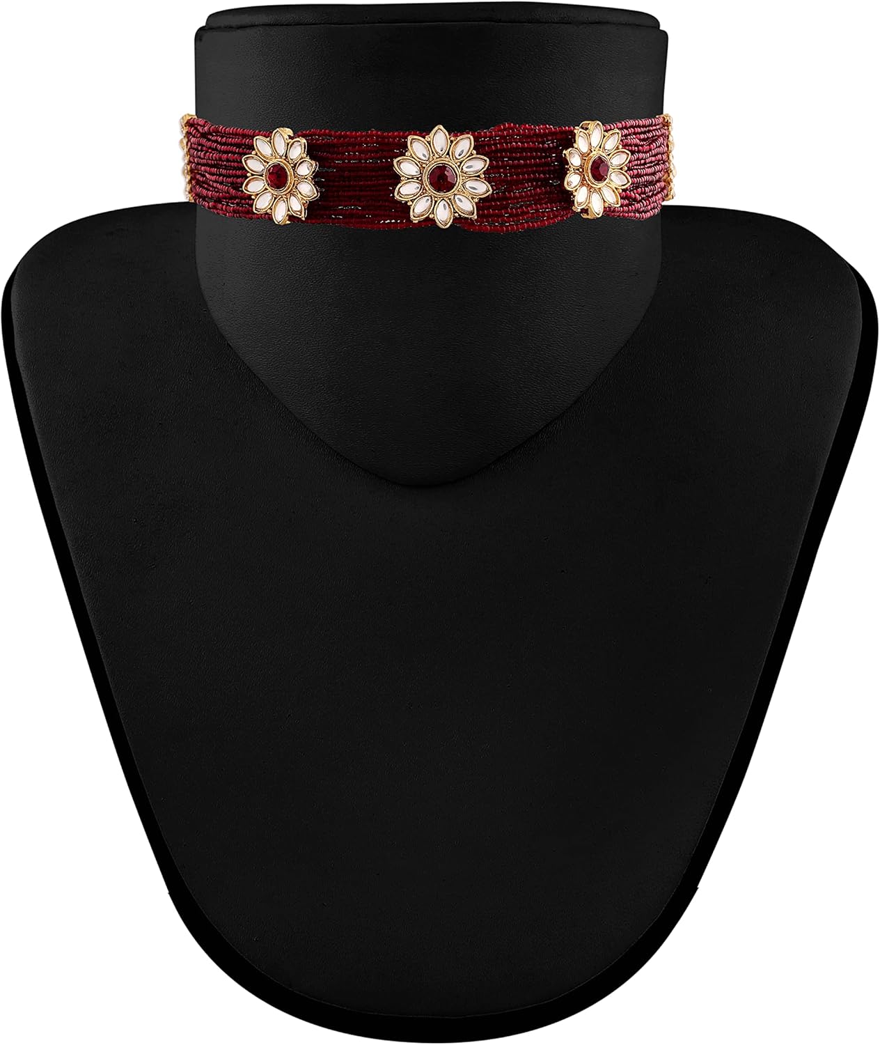 DIMENSIONS: Necklace Size – 22.5 cm x Width – 2.8 cm, Earring Top 2.5 cm x Width – 2.5 cm, Weight – 46 gms. This beautiful choker necklace is a fragile masterpiece that graces the neck with its intricate design. Adorned with rigorously chosen stones and lustrous pearls, it effortlessly combines conventional attract with a contemporary aesthetic. The gold plated hyperlinks elegantly embrace the neck, reflecting a mix of heritage and up to date magnificence. The stone work on the necklace provides a charming sparkle, enhancing its total attract. Alter the size of the necklace to fit your choice and outfit, guaranteeing a cushty and ideal match. Whether or not you are attending a marriage, a festive celebration, or a conventional gathering, this versatile jewelry set enhances a wide range of ensembles. It arrives elegantly packaged, making it a perfect present for your self or a liked one.