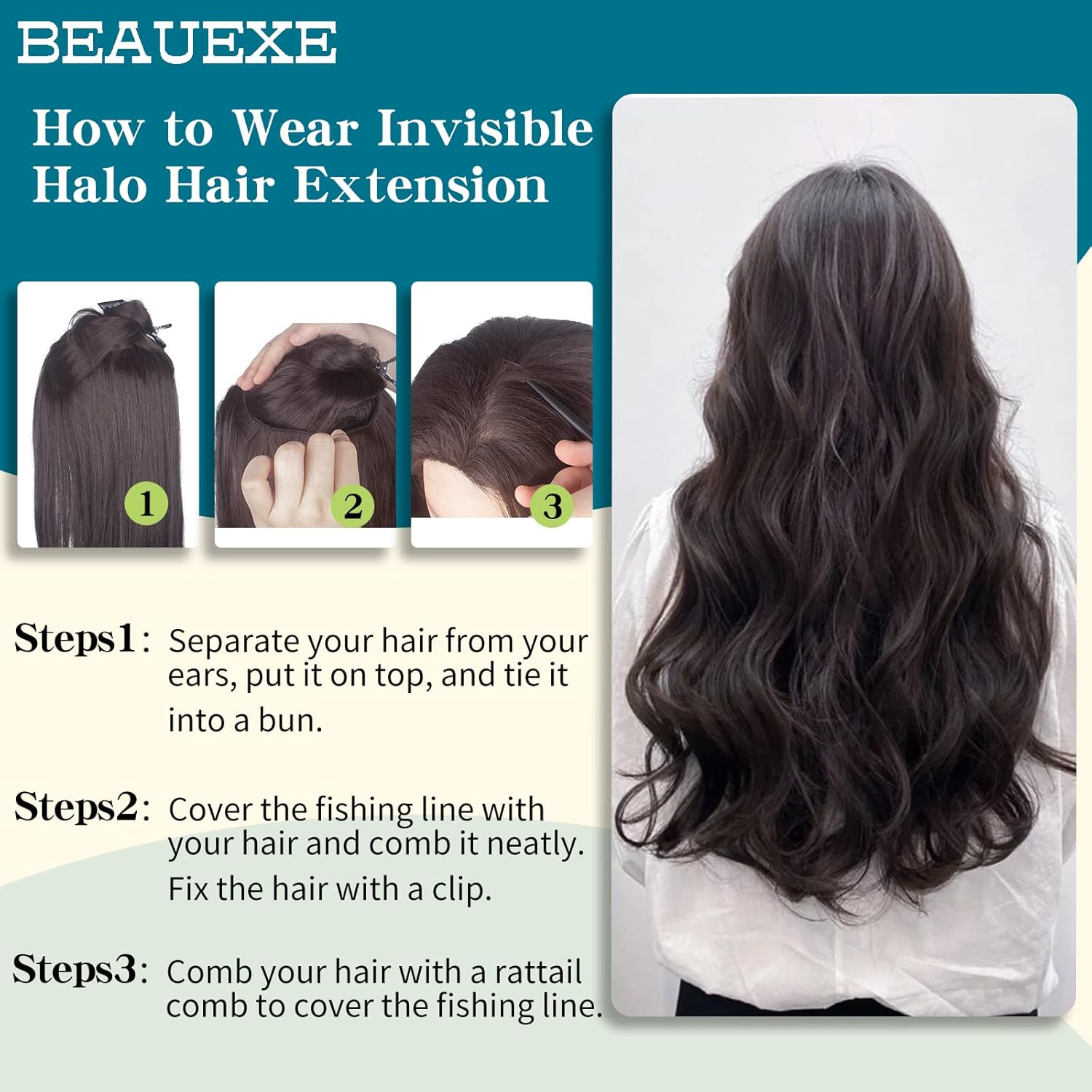 SUPER EASY-It is time to improve your hair texture and size with BEAUEXE’s halo extensions! No tape, no glue and no sew!Pure wavy hair extensions with detachable clip and adjustable invisible clear wire can simply enhance your hair quantity,size texture,shade or model shortly.