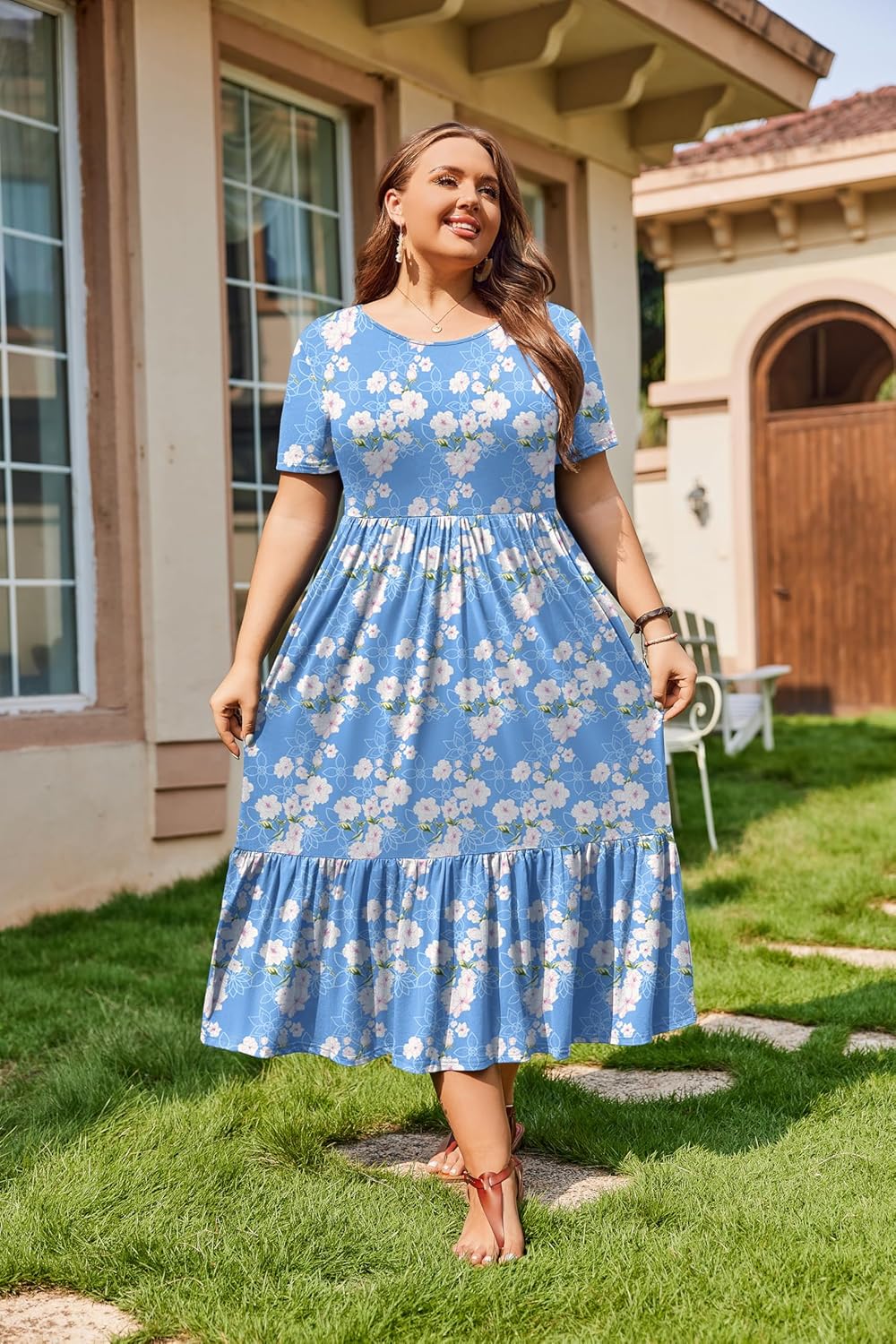 IN’VOLAND Ladies Summer time Quick Sleeve Unfastened Plain Day by day Plus Dimension Lengthy Maxi Costume