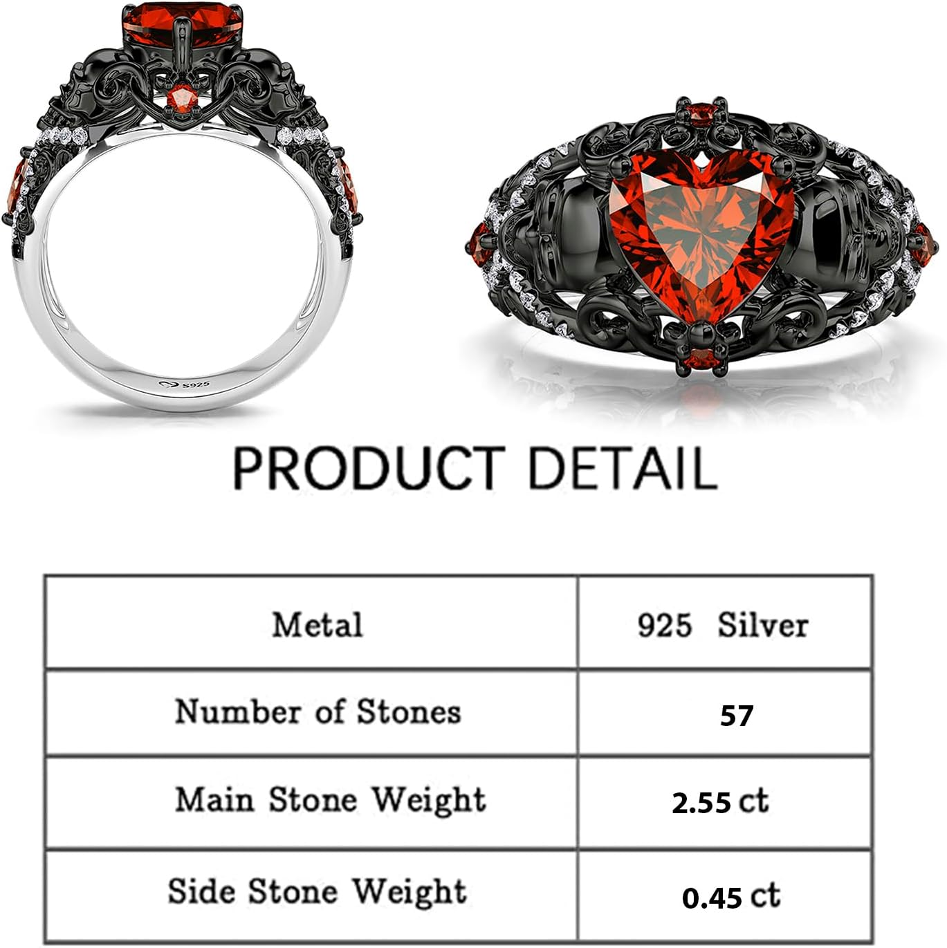 Jeulia 2.55ct Skull Engagement Ring Sterling Silver Heart Cut Red Diamond Ruby Ring Band Black CZ Wedding Promise Anniversary Romantic Jewelry for Women with Gift Box