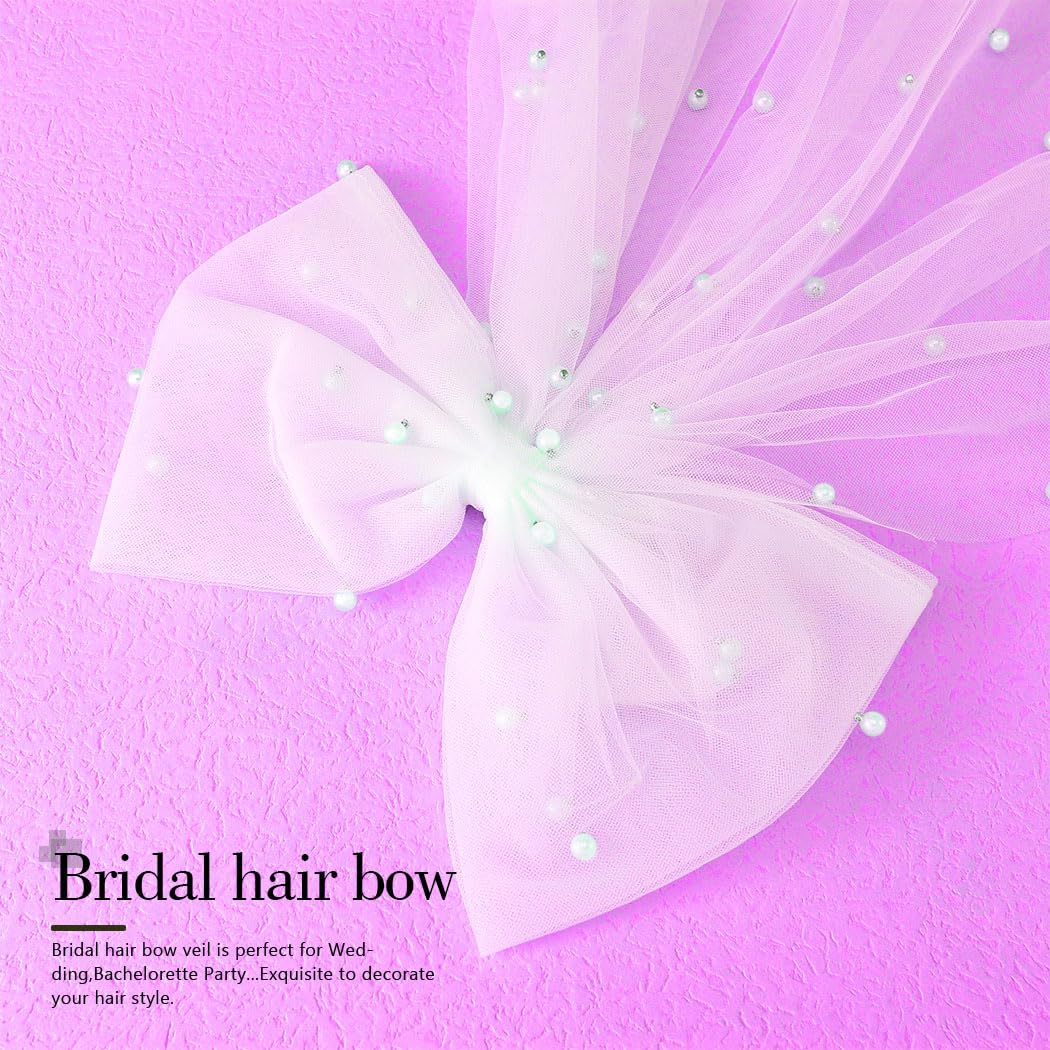 Bow pearl veil has 23cm/9.1inch vast and 50cm/19.7inch lengthy.Pearls are fixed to the veil with clasps which not fall off simply and provides this pearl white hair bow a blinding diamond like sheen.
