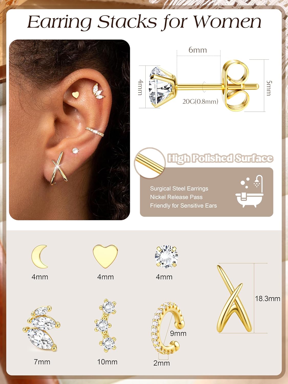 Jstyle 14K Gold Plated Earrings for Women Trendy Hypoallergenic Surgical Steel Earring Stacks Cartilage Earring Sets for Multiple Piercing Small Cute CZ Studs Cuffs Women’s Dainty Jewelry Gifts