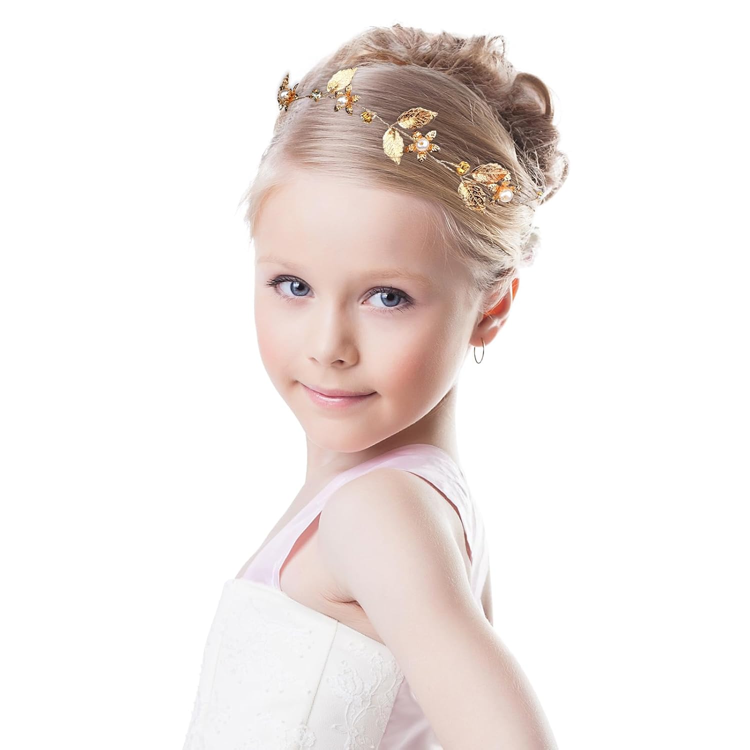 KALIONE Gold Leaf Headband Wedding Bridal Boho Hair Piece Flower Girl Headpiece Pearl Accessories for Kids Gold Hair Vine for Prom Party