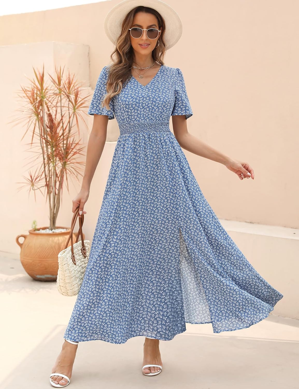 Kranda Ladies Summer season Brief Sleeve Swing Smocked Waist Floral Boho Maxi Gown