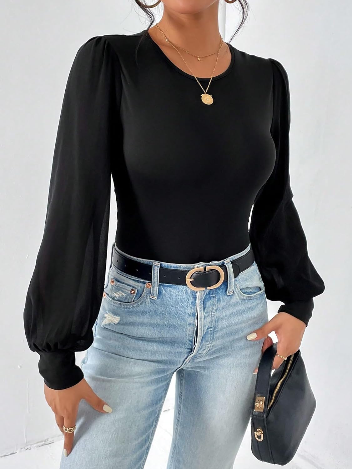 Elegant lengthy lantern sleeve bodysuit prime includes a relaxed arm match with a modern again, excellent for layering or sporting alone.