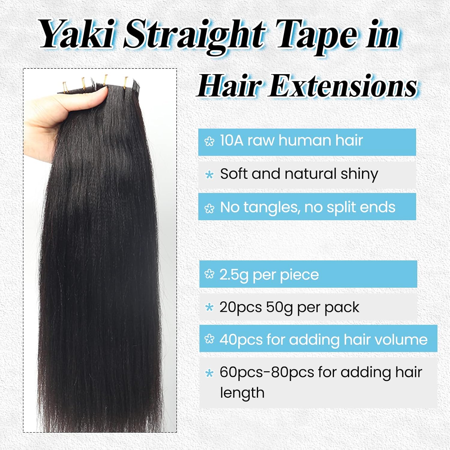 【20 Items 50G Tape in Extensions】Tape ins for black ladies human hair, 2.5g/pcs, 20pcs/50g per pack. Similar items and gram for every size, so longer the size, much less hair. If select longer size, advocate order extra packs to get higher hair look. 2-3 packs for including hair quantity, 3-4 packs for including hair size.