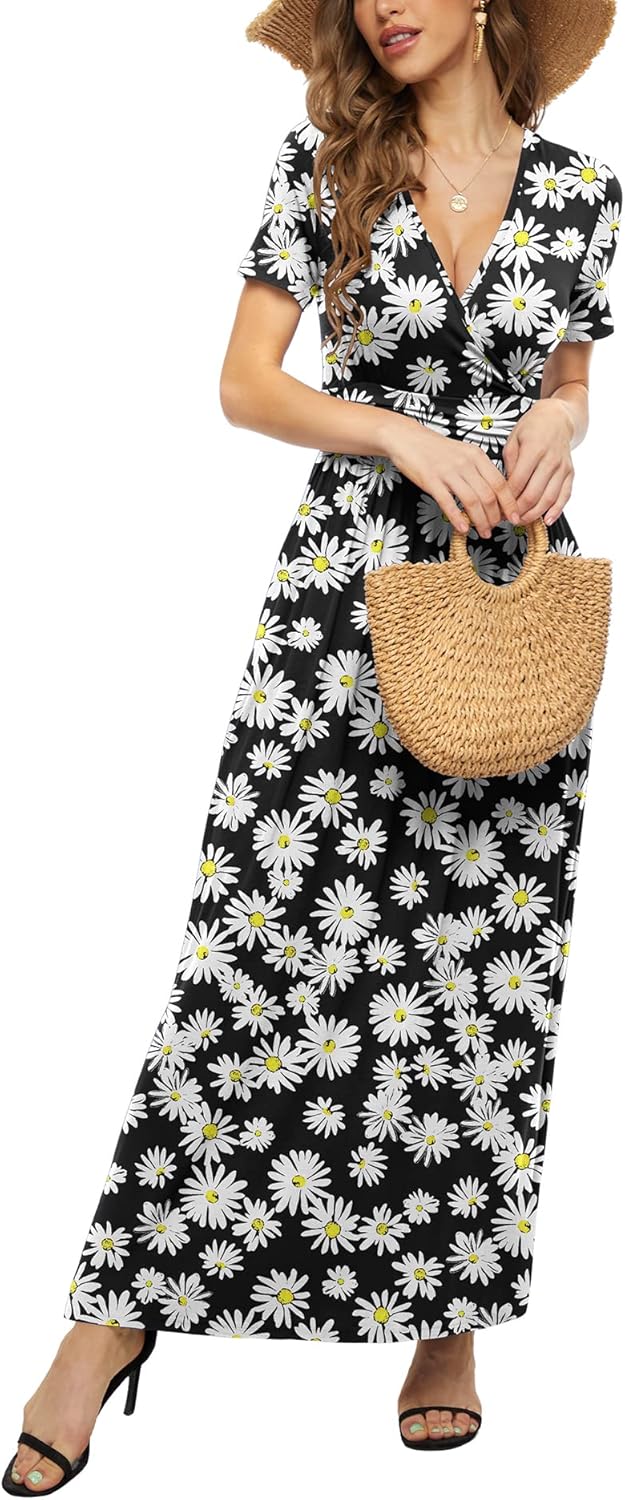 LILBETTER Women’s Summer Short Sleeves Dress Wrap Waist Maxi Dresses with Pockets