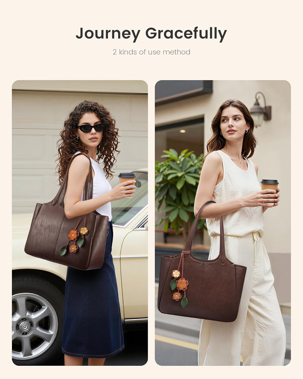 LOVEVOOK Tote Bag for Women, Leather Vintage Work Bag with 40oz Cup Holder,Nurse Teacher Shoulder Bag,Roomy,6 Pockets | Leak-resistant