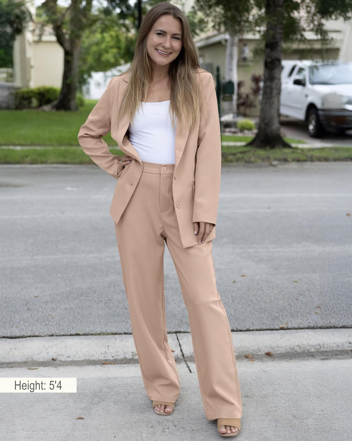 A womens 2 piece pants units that includes a blazer with single breasted design, peak lapels, entrance flap pockets, and lengthy sleeves
