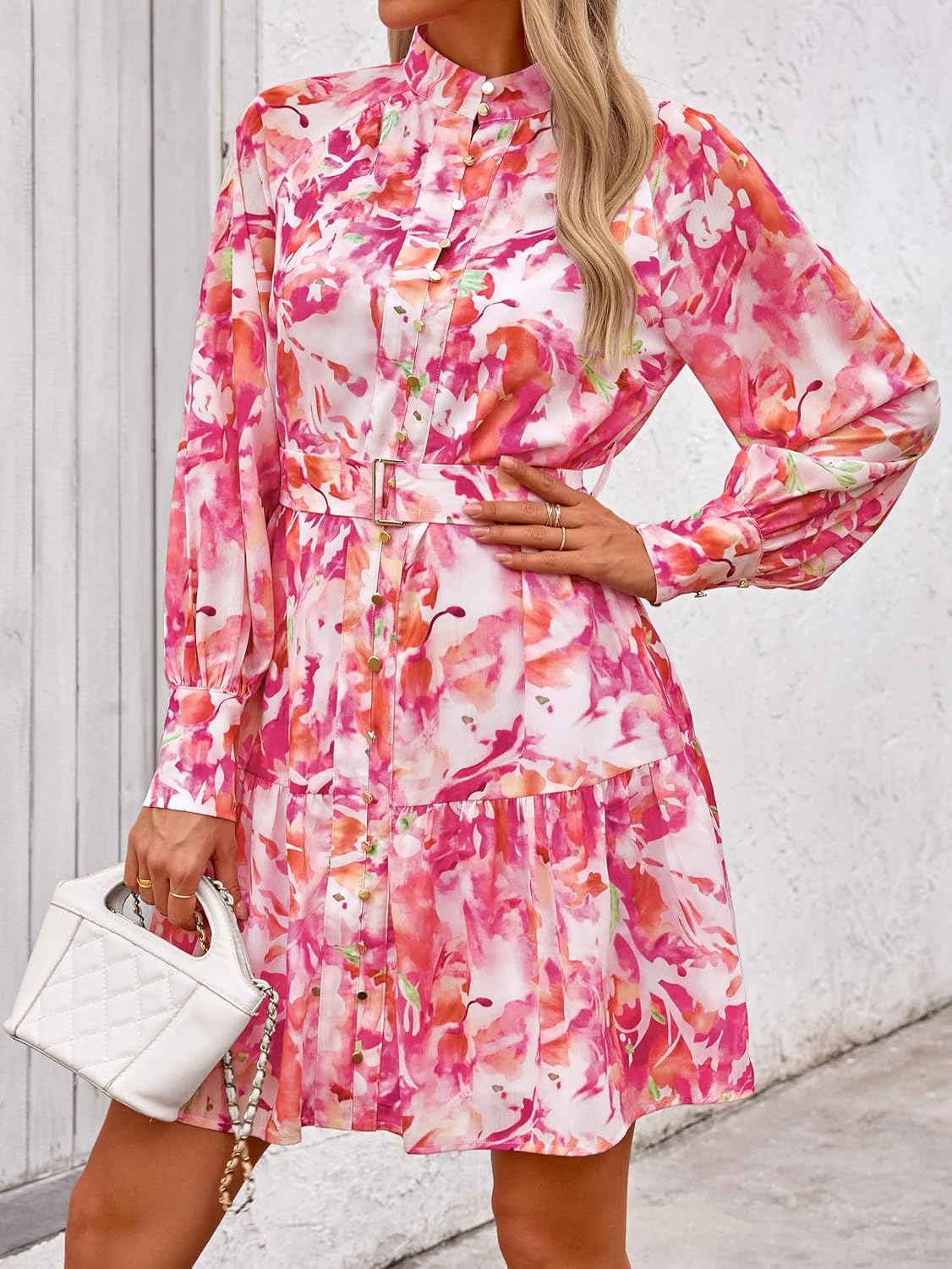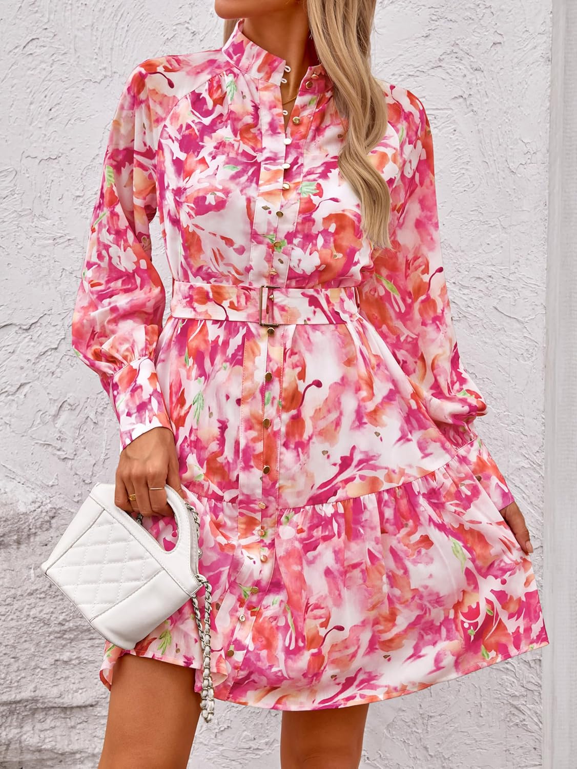 MASCOMODA Stand Collar Floral Shirt Gown Tie Waist Boho Clothes for Girls