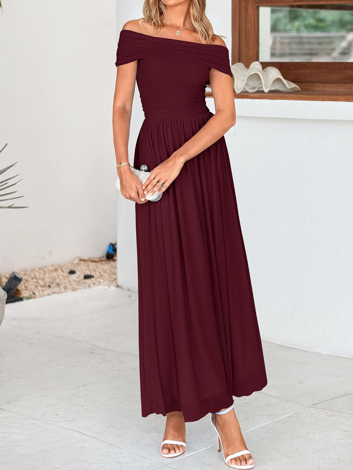 MASCOMODA Women Off The Shoulder Mesh Maxi Dress Bodycon Ruched Formal Sleeveless Pleated Cocktail Wedding Guest Long Dresses