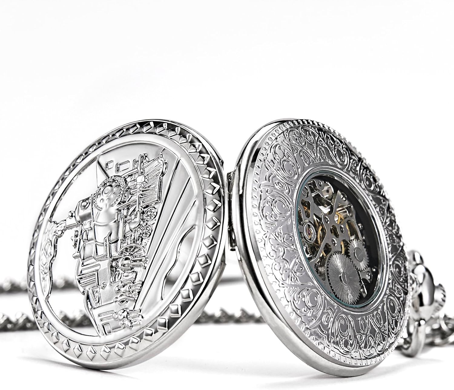 Mens Womens Antique Mechanical Pocket Watch Skeleton Silver Case Steam Train Railroad Roman Numerals