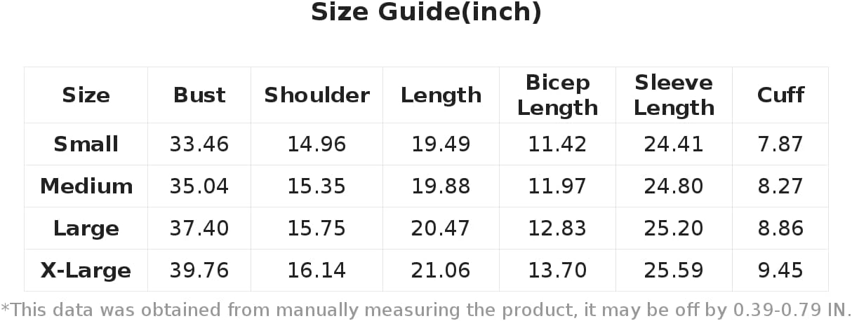 XL:Bicep Size:13.7IN,Bust:39.8IN,Cuff:9.4IN,Size:21.1IN,Shoulder:16.1IN,Sleeve Size:25.6IN